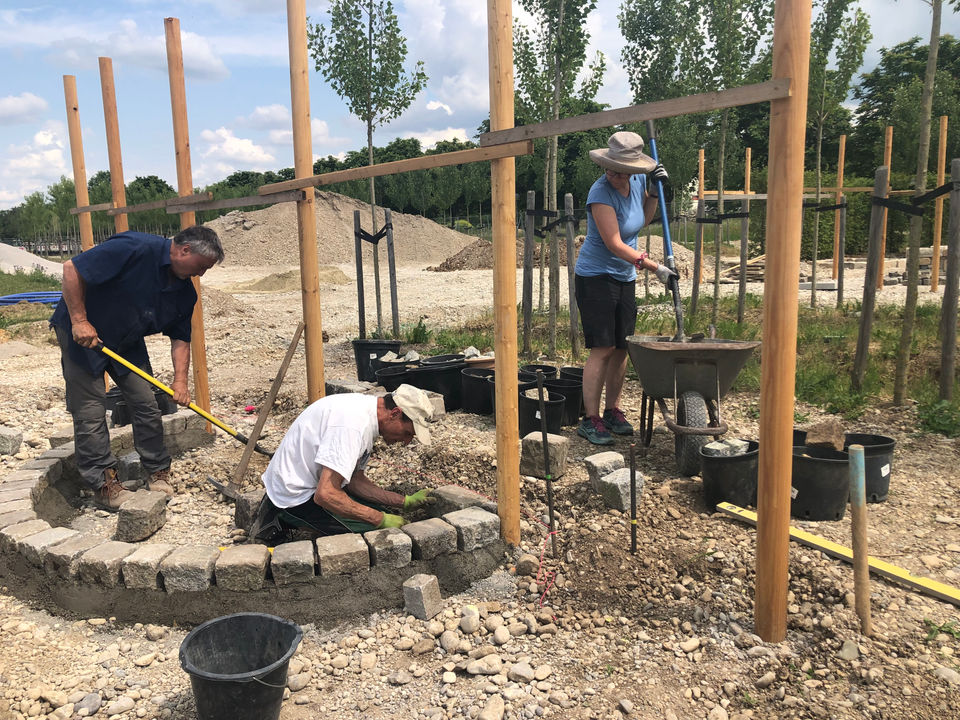 Der Garten wurde im Laufe des Jahres 2023 und Frühjahr 2024 in gemeinschaftlicher Arbeit von ehrenamtlichen Vereinsmitgliedern des NaturGarten e.V. angelegt. An mehreren Baustellenwochenenden entstand Stück für Stück ein individueller Reihenhausgarten, der an Artenreichtum und Strukturvielfalt kaum zu übertreffen ist!